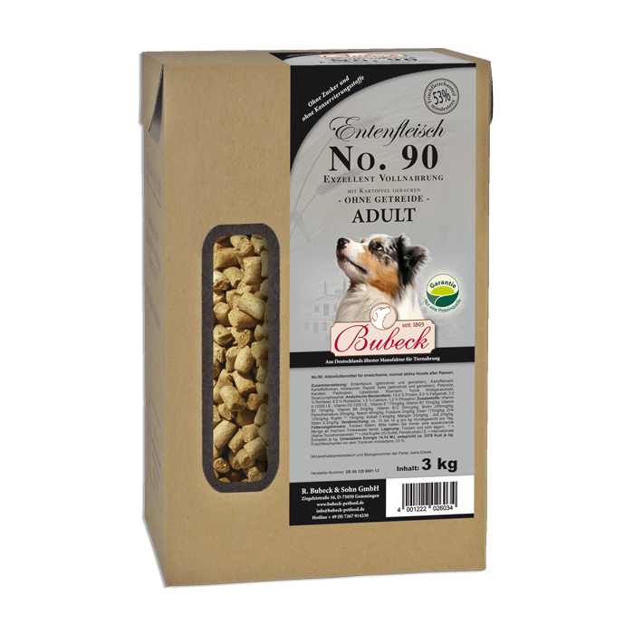 Bubeck No 90 to pełnowartościowa, bezzbożowa karma dla dorosłych psów o przeciętnej aktywności. Karma zawiera wyłącznie mięso kaczki, dzięki czemu może być podawana psom z alergią czy wrażliwym układem pokarmowym. Dodatek jaja, warzyw i ziół wspiera układ odpornościowy psa, pomaga tez dbać o kondycję sierści i skóry. Karma jest powoli pieczona w kamiennym piecu, dzięki czemu zachowuje właściwości odżywcze i ma przyjemny zapach. Nie zawiera cukru ani sztucznych dodatków czy konserwantów.