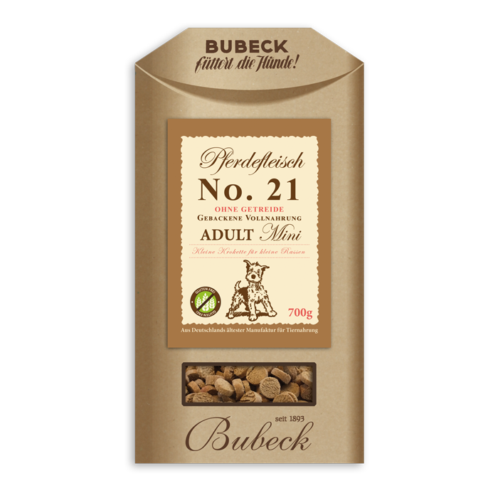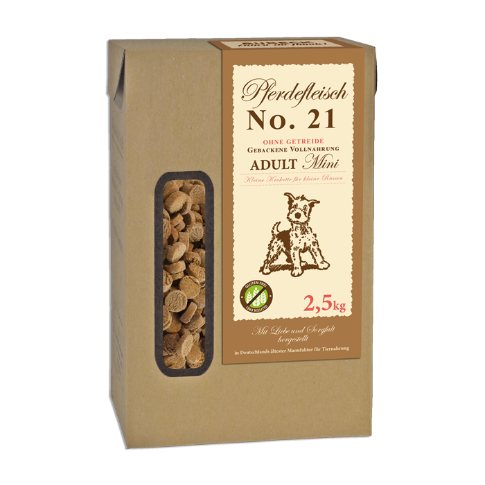 Drobne, pyszne krokieciki, przeznaczone dla dorosłych psów ras małych i miniaturowych. Zawierają tylko jeden rodzaj mięsa - koninę, uznawaną za jedno z najmniej alergizujących mięs. Będą odpowiednie nawet dla najbardziej wrażliwych psich żołądków. Bez dodatku cukru, zbóż, sztucznych barwników czy konserwantów. Bogate w mięso i pełne witamin warzywa, owoce i zioła. Karma no 21 jest pieczona tradycyjną metodą w kamiennym piecu, dzięki czemu zachowuje własności odżywcze. Odpowiednio twarde krokiety ścierają płytkę nazębną i pomagają zapobiegać osadzaniu się kamienia.