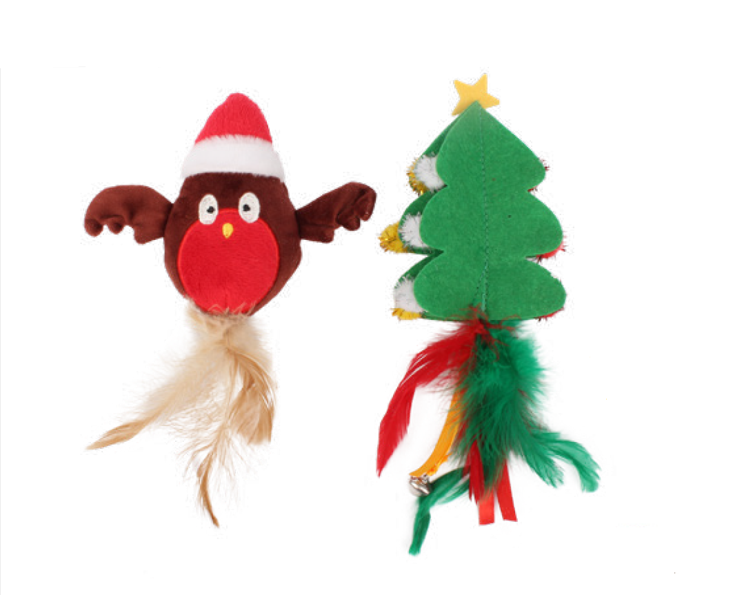 Pluszowe zabawki w kształcie sowy i choinki to idealna propozycja do wielu godzin zabaw. Odstające elementy i piórka na pewno zainteresują każdego kota. 2 zabawki to 2x więcej radości!