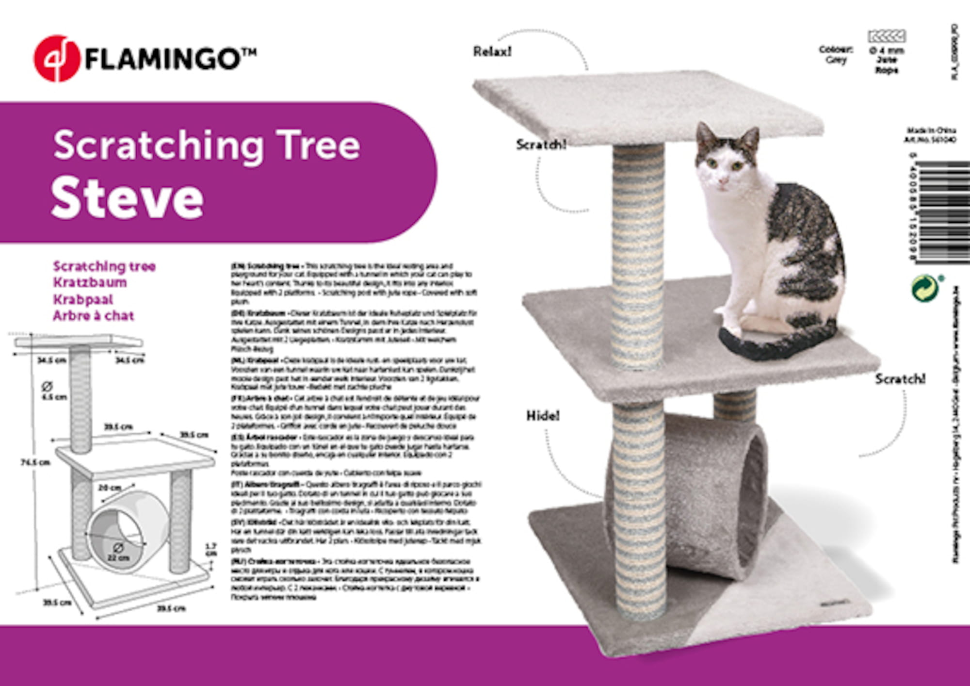 Drapak dla kota Steve będzie idealny dla kociąt oraz małych i średnich kotów. Jego całkowita wysokość to 76 cm.