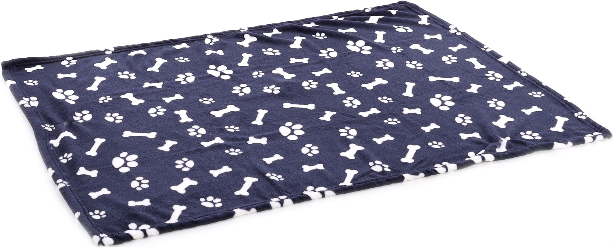 Podaruj swojemu pupilowi super miękki kocyk dla psa lub kota Zuma! Granatowe akcesorium w białe kości będzie dodatkowym elementem ozdobnym w pomieszczeniu!