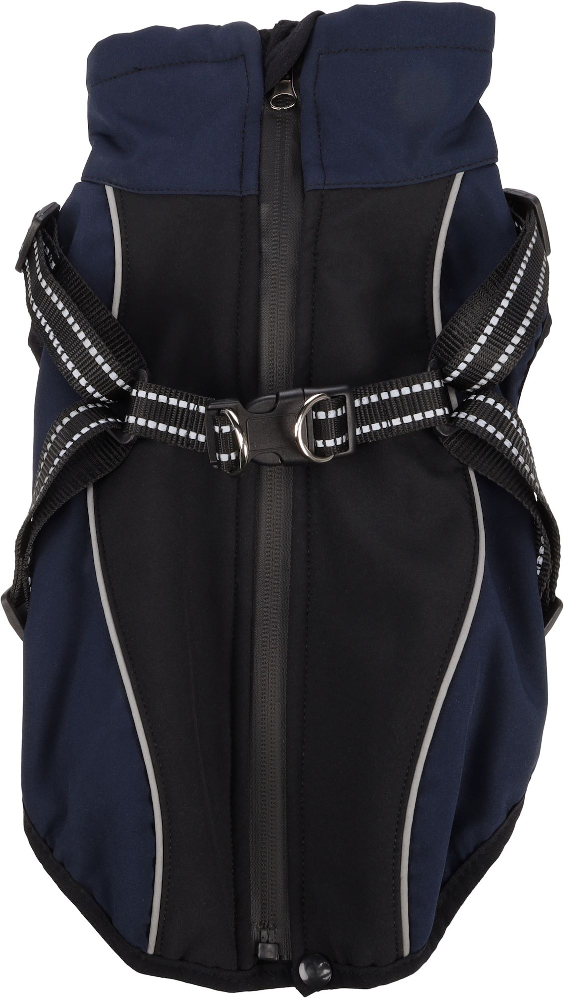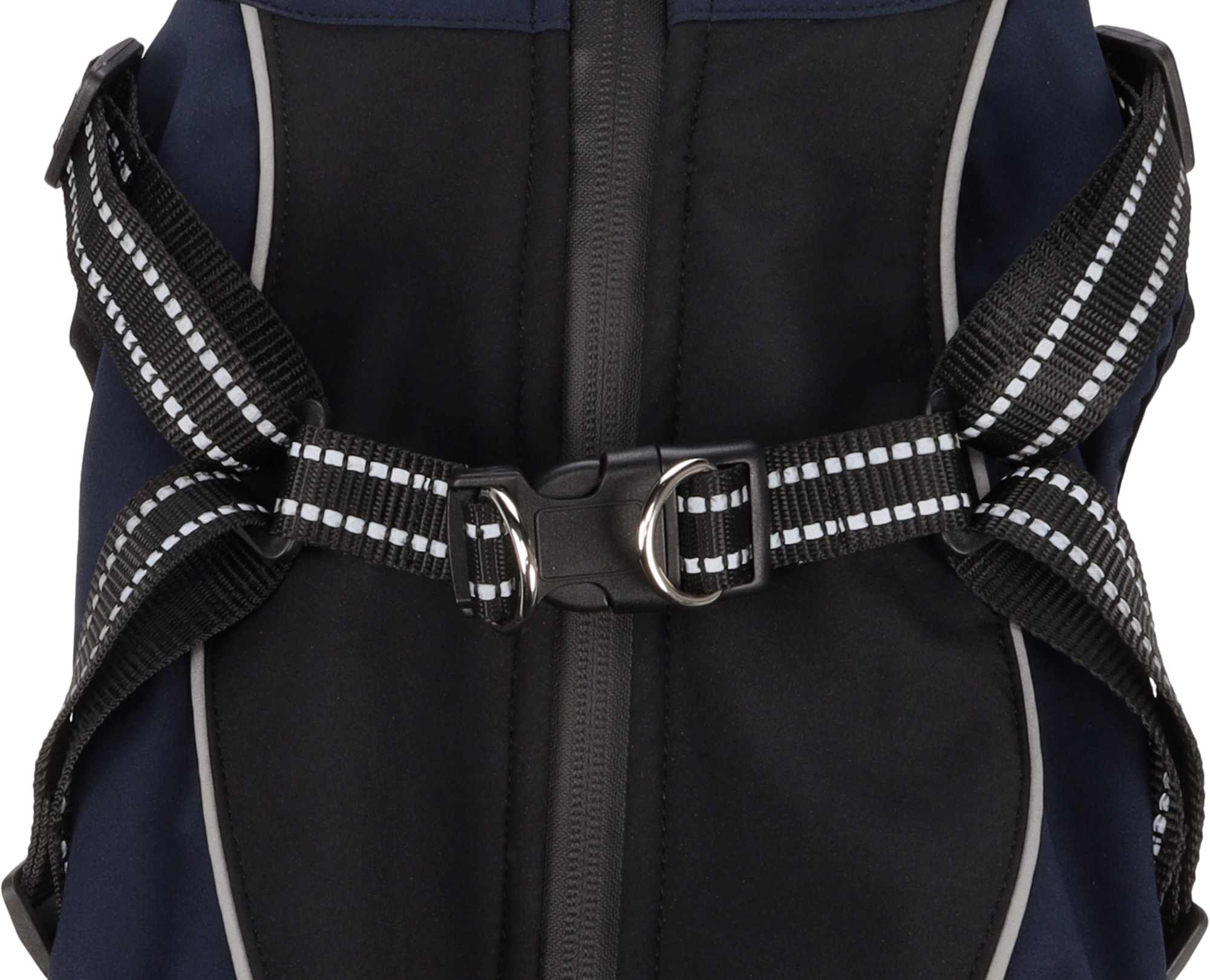 Granatowa kurtka dla psa z kolekcji Dexter zapewnia ciepło podczas jesiennych oraz zimowych spacerów. Wykonana została z przyjemnego w dotyku poliestru. Wewnątrz obszyta ciepłym polarem. Kurteczka zapinana jest z góry na wygodny suwak. Praktyczna stójka stanowi dodatkową ochronę przed wiatrem.