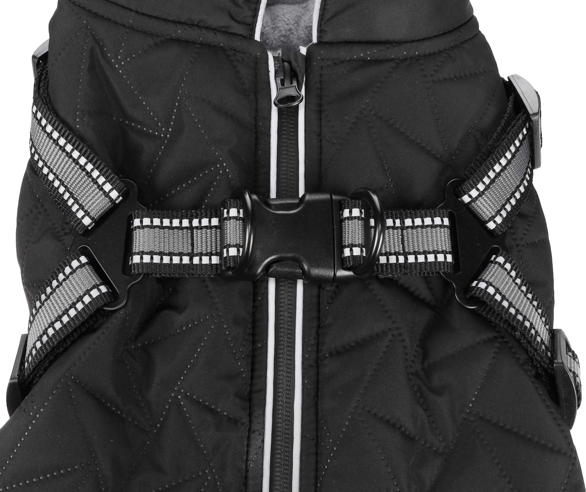 Kurtka dla psa Duker zapewnia ciepło podczas jesiennych oraz zimowych spacerów. Wykonana została z przyjemnego w dotyku poliestru. Wewnątrz obszyta ciepłym polarem. Kurteczka zapinana jest z góry na wygodny suwak.
