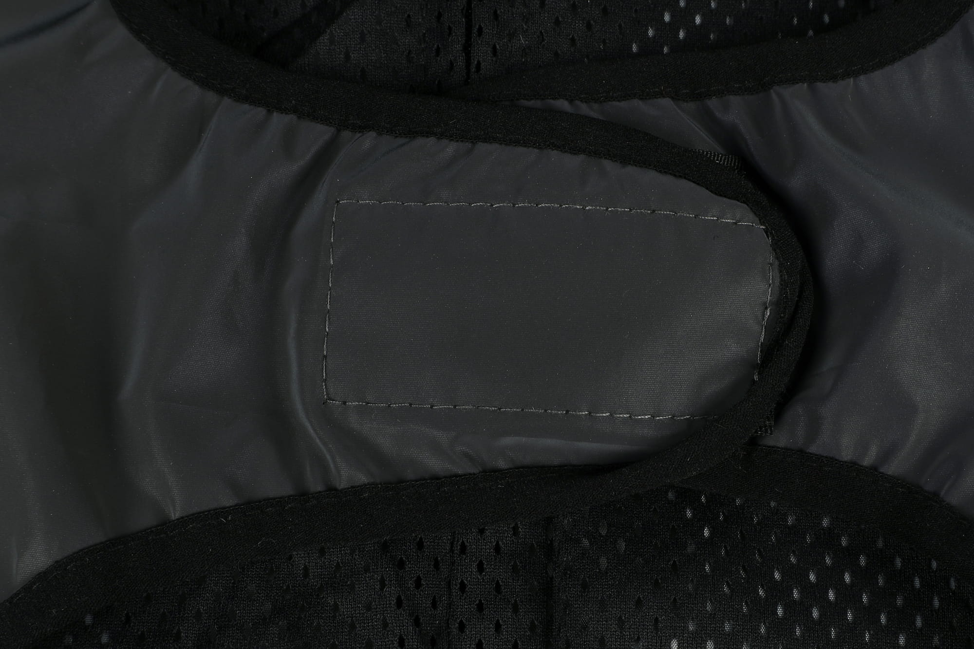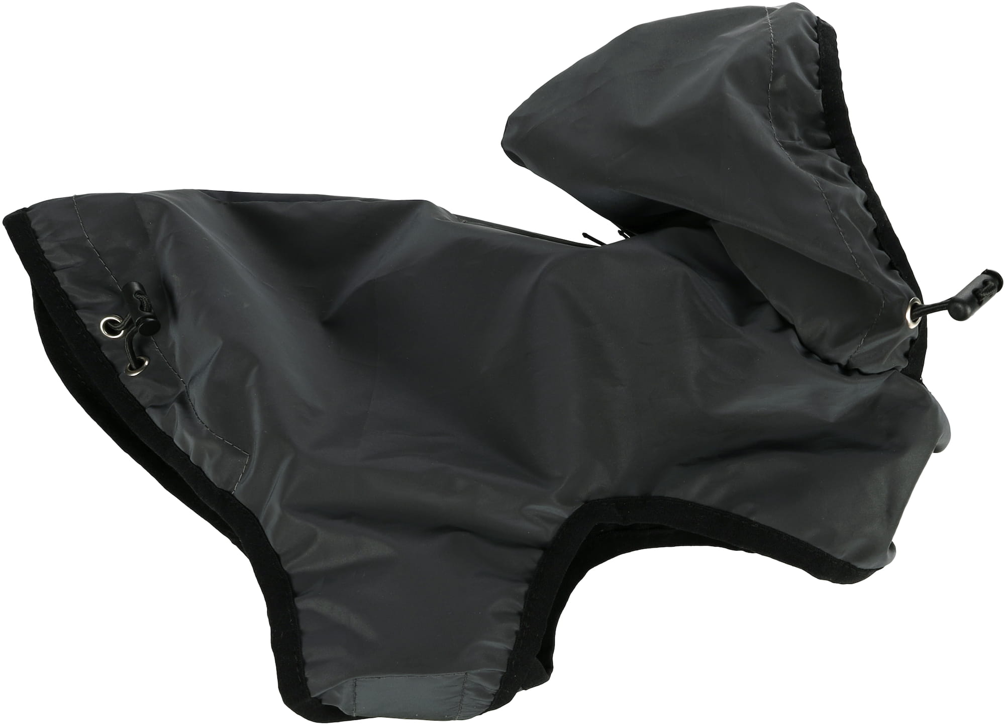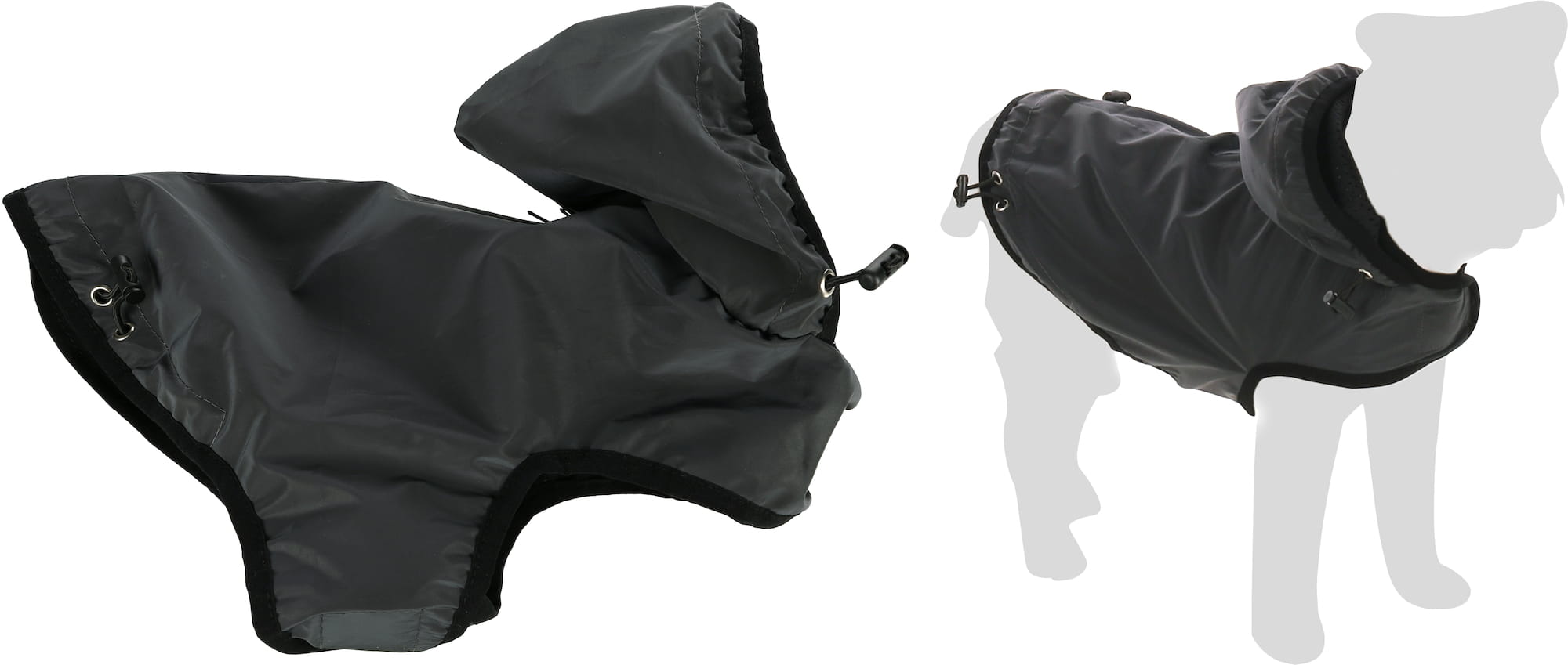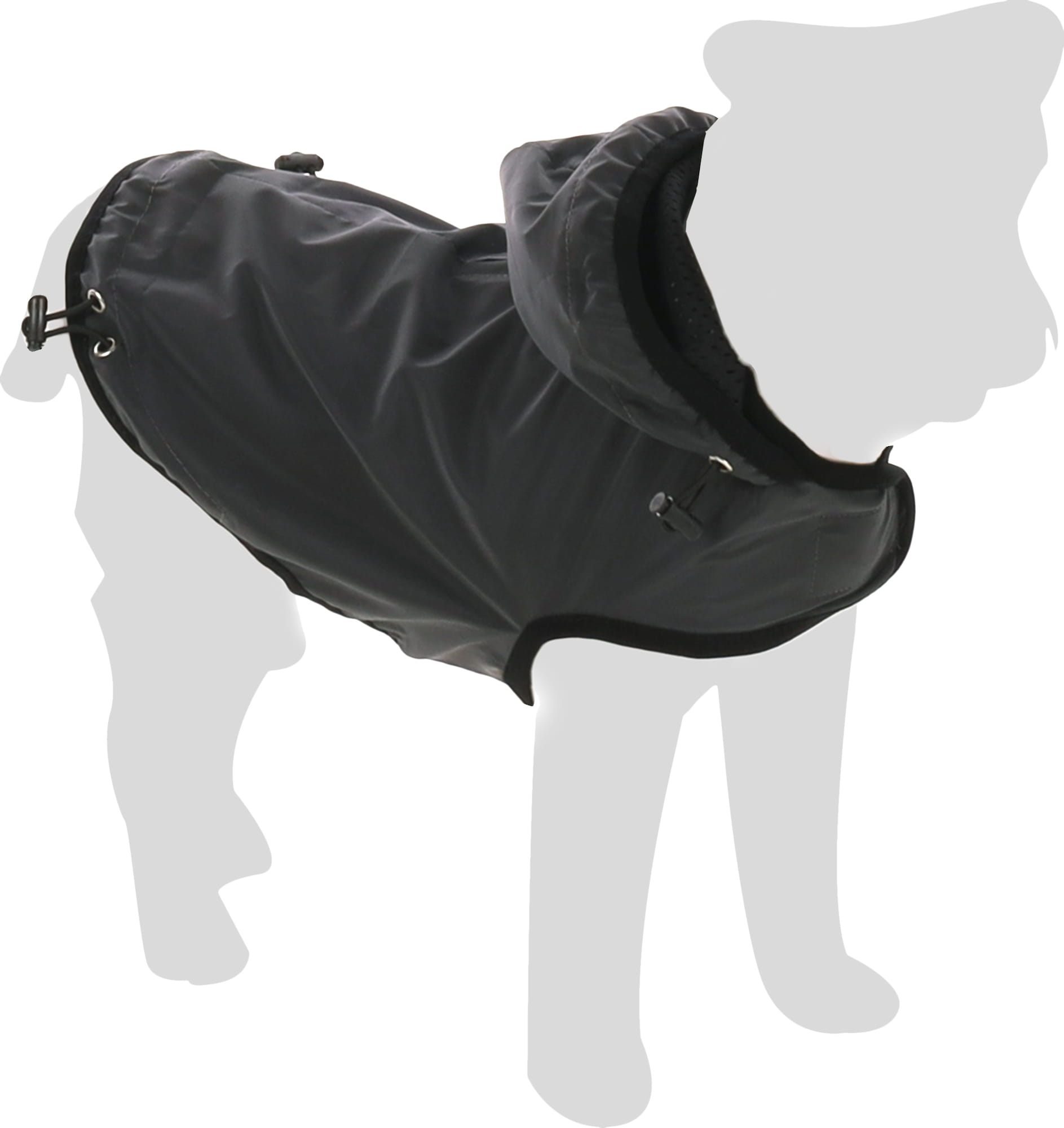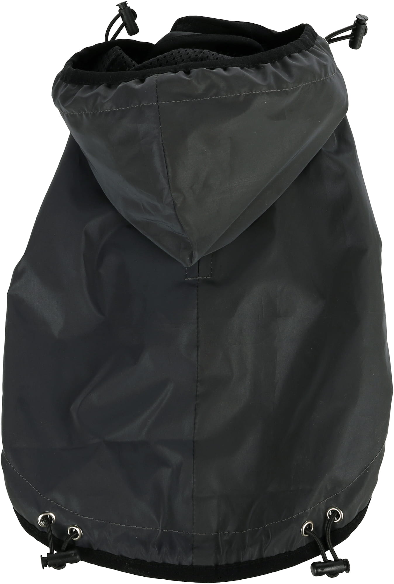 Posiada kaptur i regulowany otwór na podpięcie obroży do smyczy