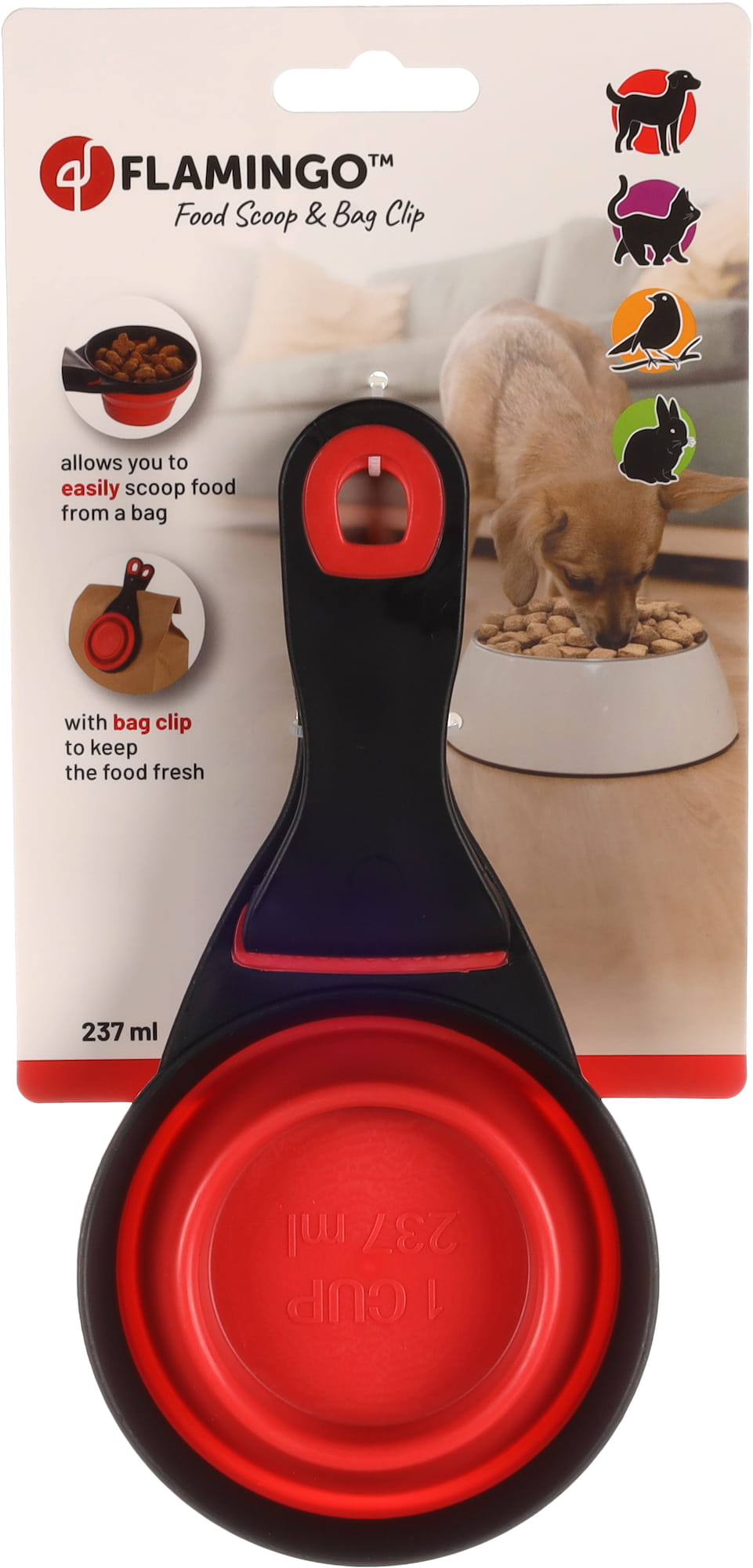 Co jest w niej najlepsze? Uchwyt jest dodatkowo klipsem, którym możesz zamknąć torbę karmy. Wszystko po to, by jedzenie zawsze pozostało świeże.