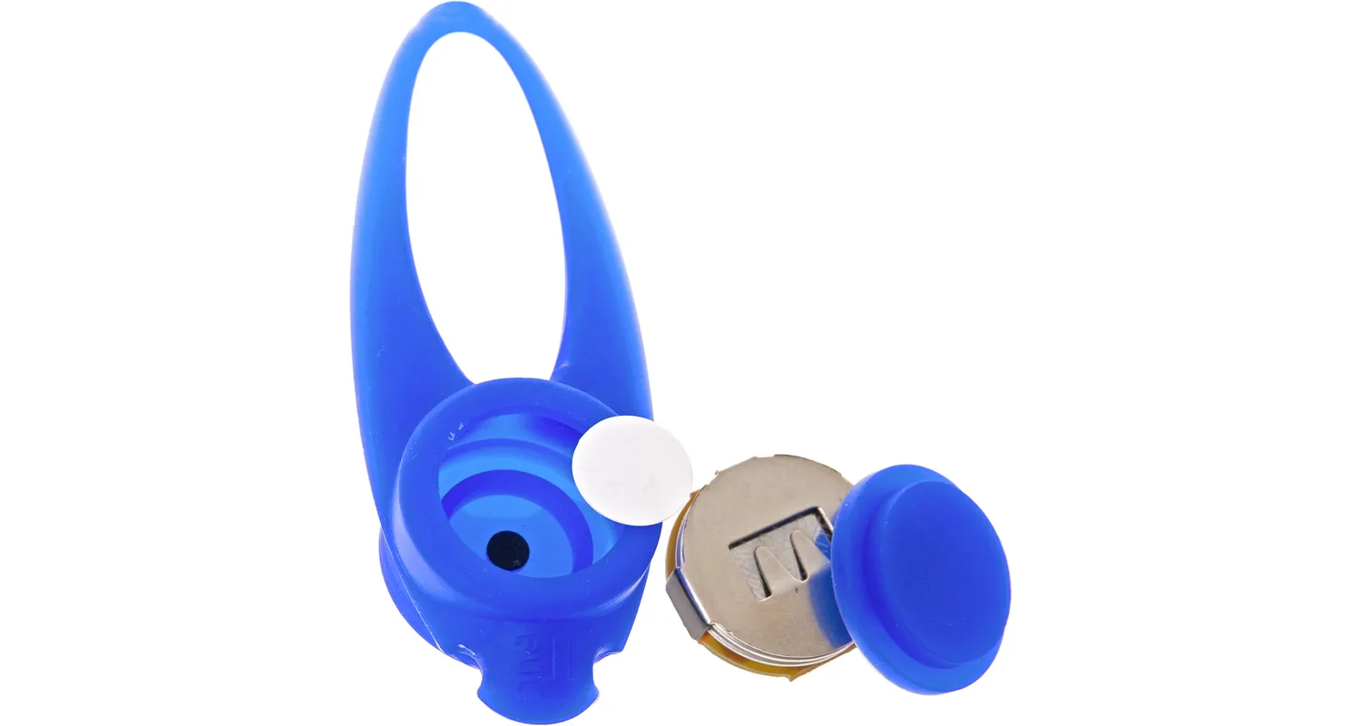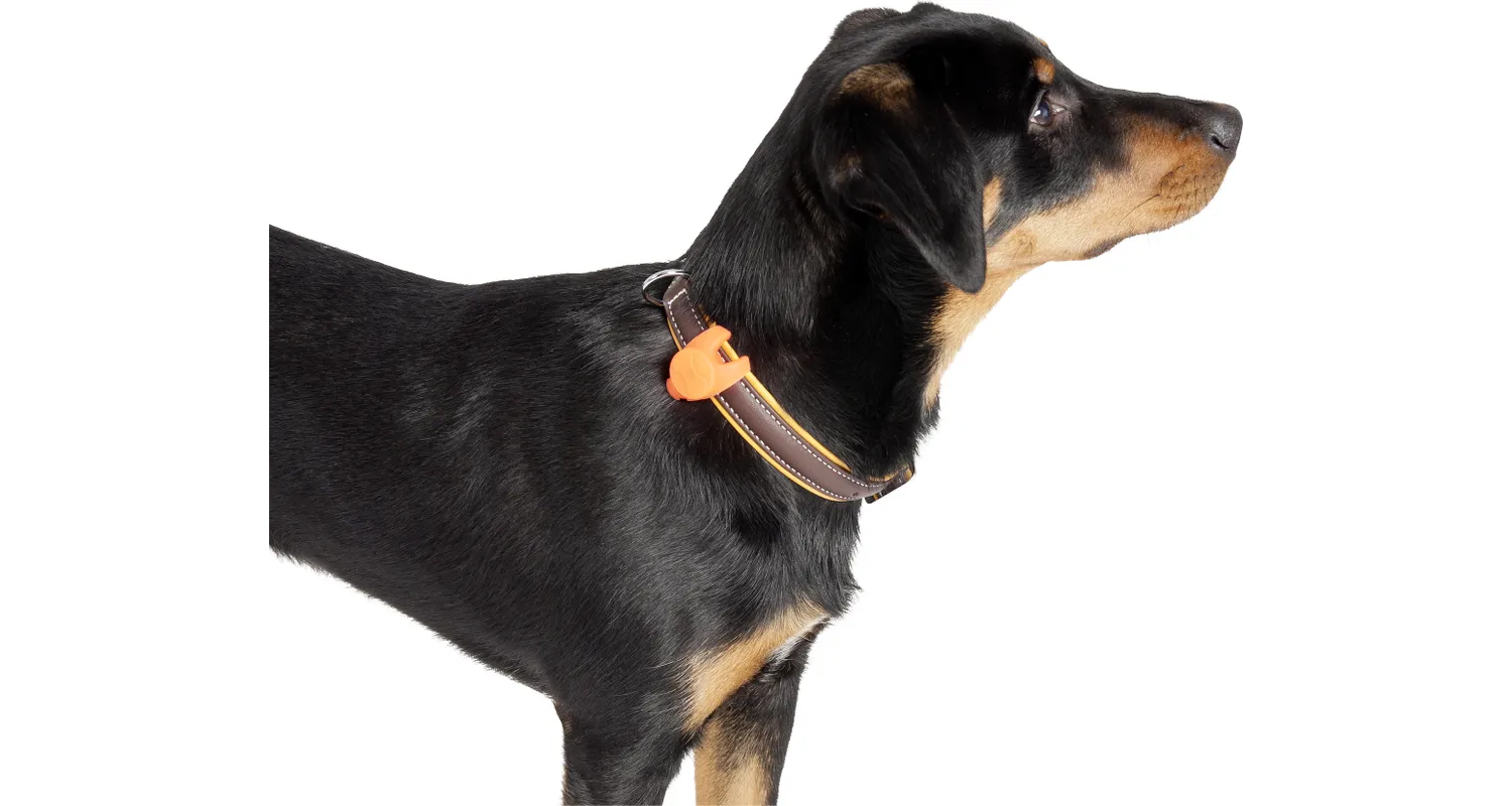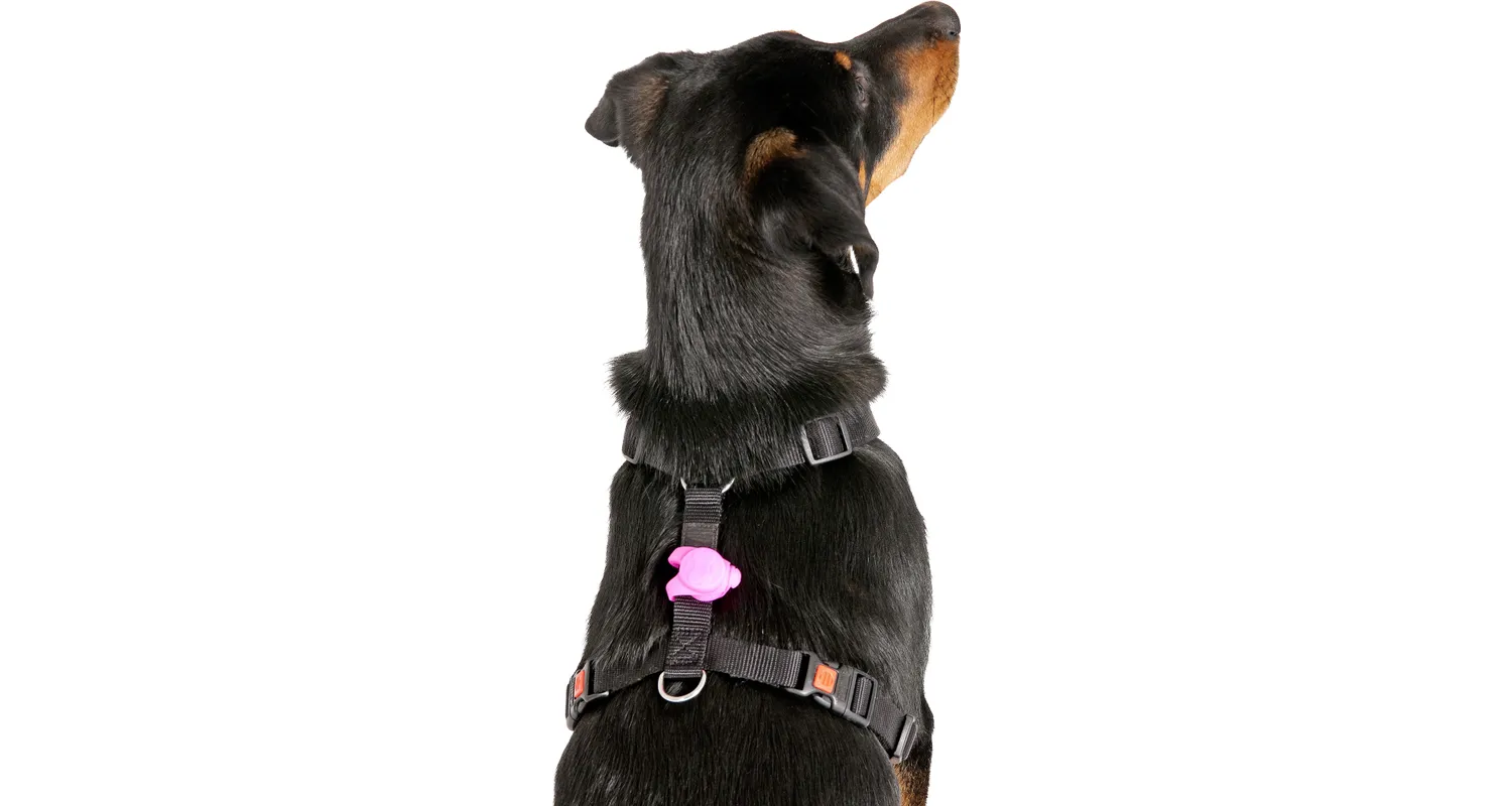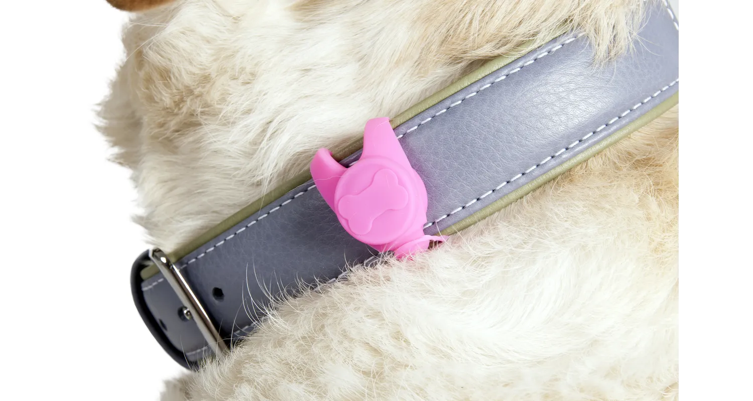 Przypinka do obroży dla psa wykonana została z silikonu. W prosty sposób można ją umieścić na obroży.