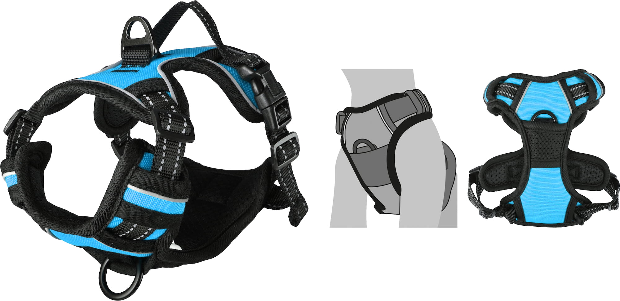 Szelki posiadają specjalny uchwyt, którym możemy przytrzymać pupila.