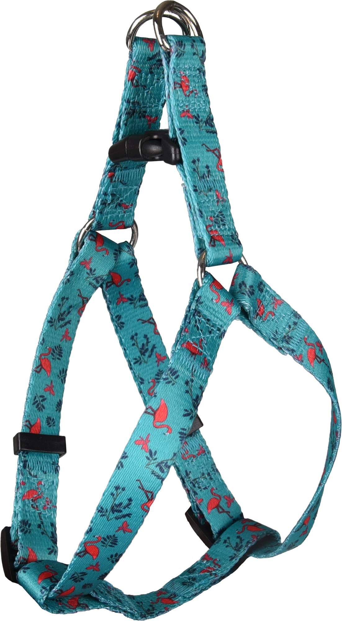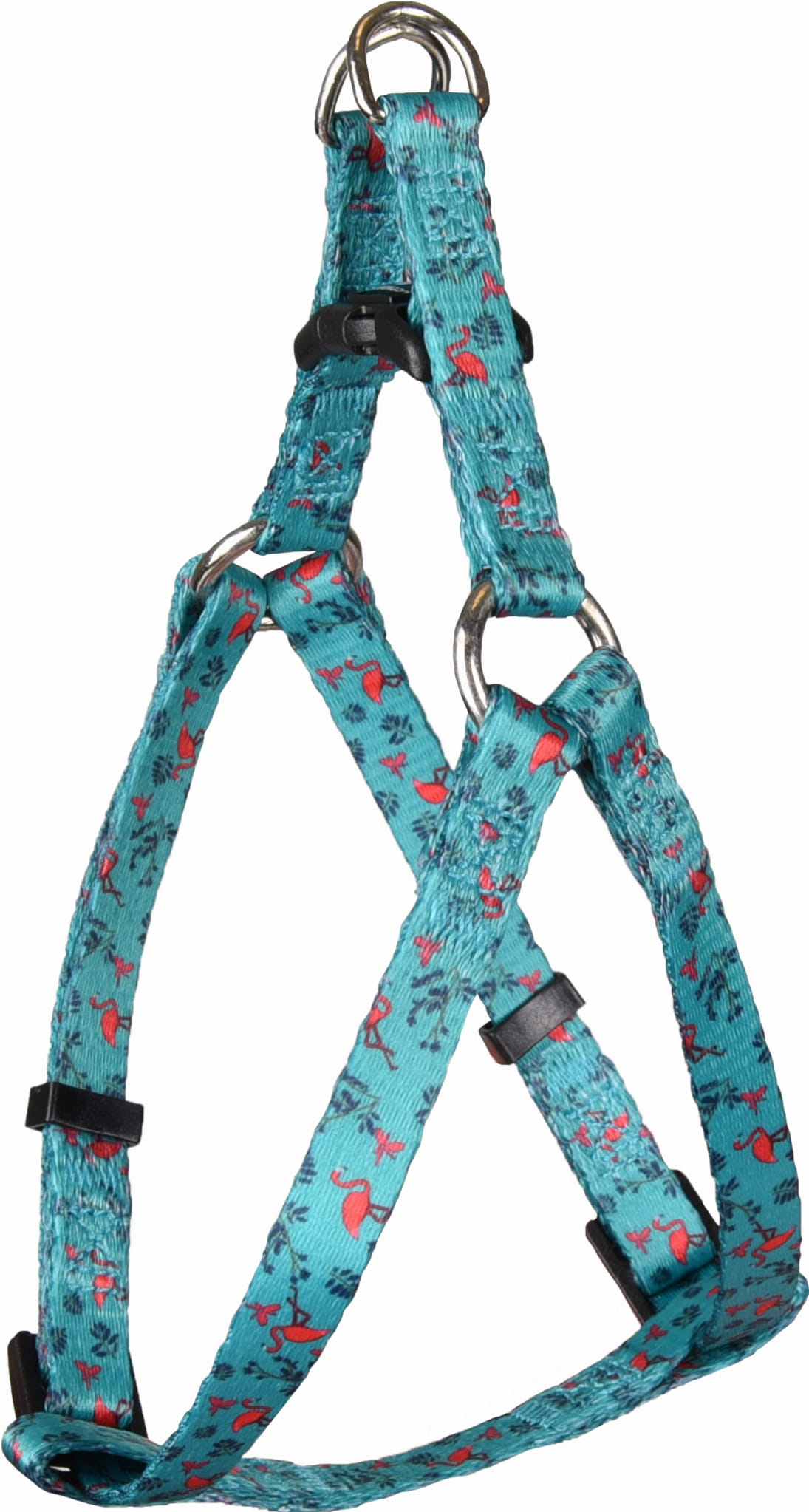 Szelki dla psa z kolekcji Samar z ciekawym motywem flamingów polecają się jako najlepsze akcesorium spacerowe.