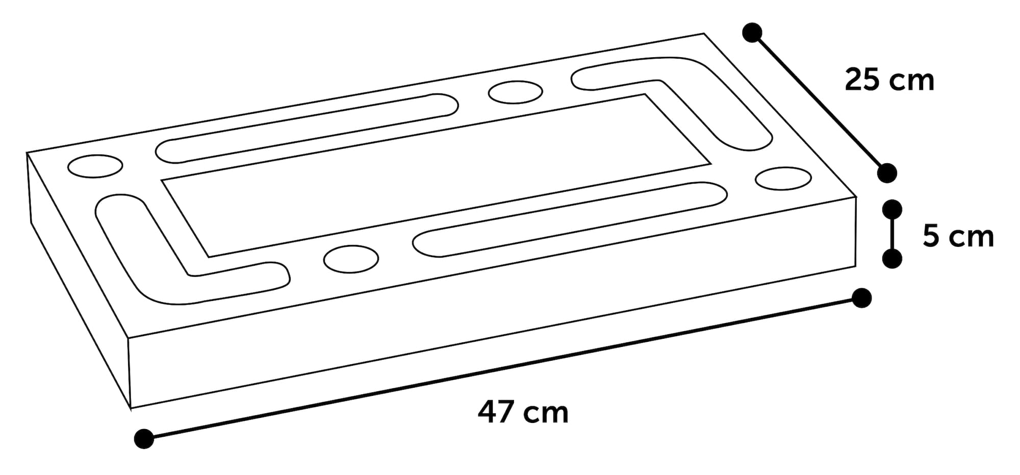 | 47 cm L x 25 cm W x 5 cm H |