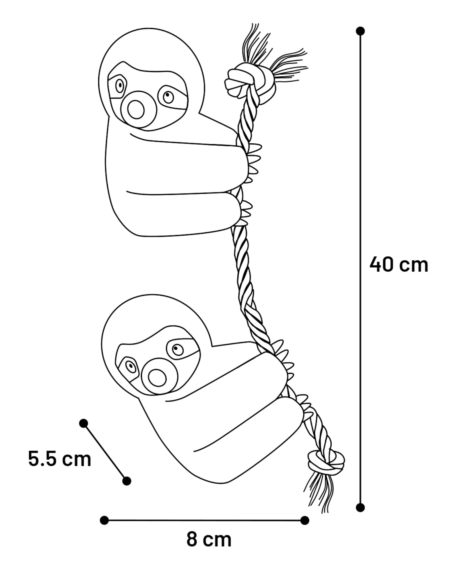 Dwa pluszaki zawieszone są na linie, która dodatkowo będzie podczas zabawy masować dziąsła pupila oraz wpływać delikatnie na czyszczenie jamy ustnej.