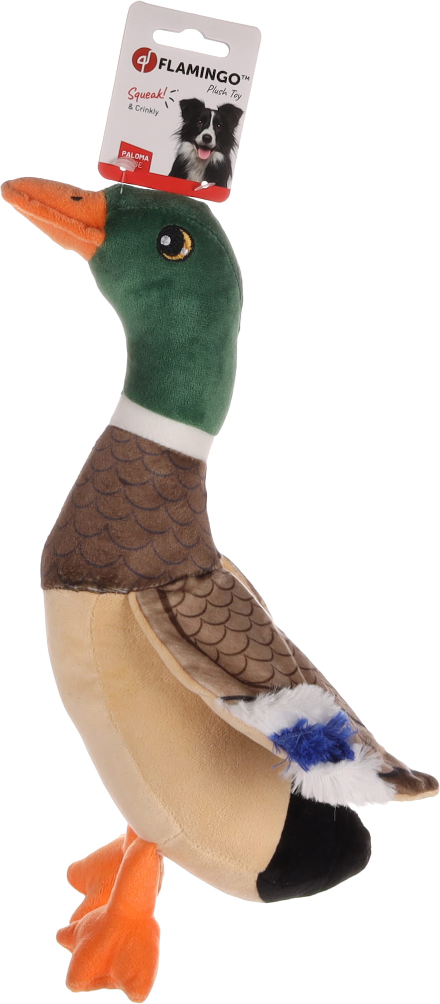 Pluszowa zabawka Paloma w kształcie kaczki. Posiada wystające i szeleszczące elementy zachęcające zwierzaka do zabawy. Dodatkową atrakcją jest zaszyta w środku piszczałka.
