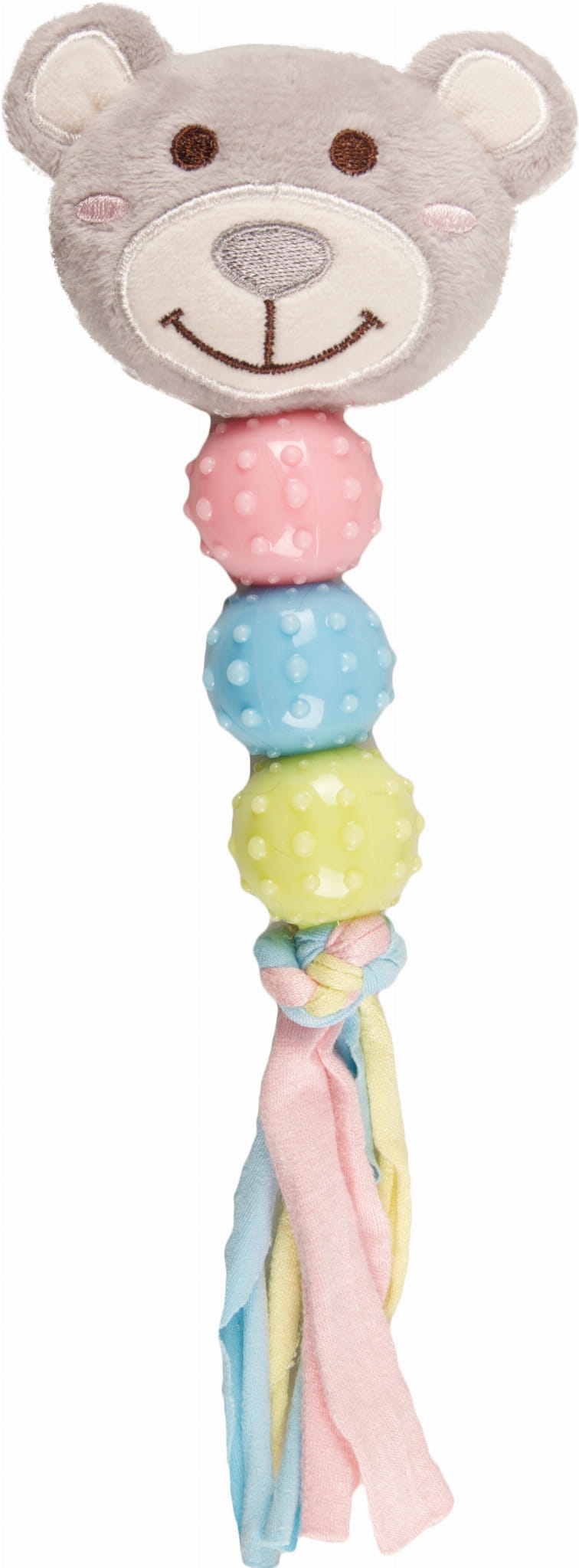 Wyjątkowa zabawka dla szczeniaka poleca się jako pierwsza przytulanka dla czworonożnego przyjaciela. Zabawka składa się z 3 części - pluszowej główki z piszczałką, gumowymi piłkami i wstążkami. Każdy z elementów zaciekawi młodego pieska.