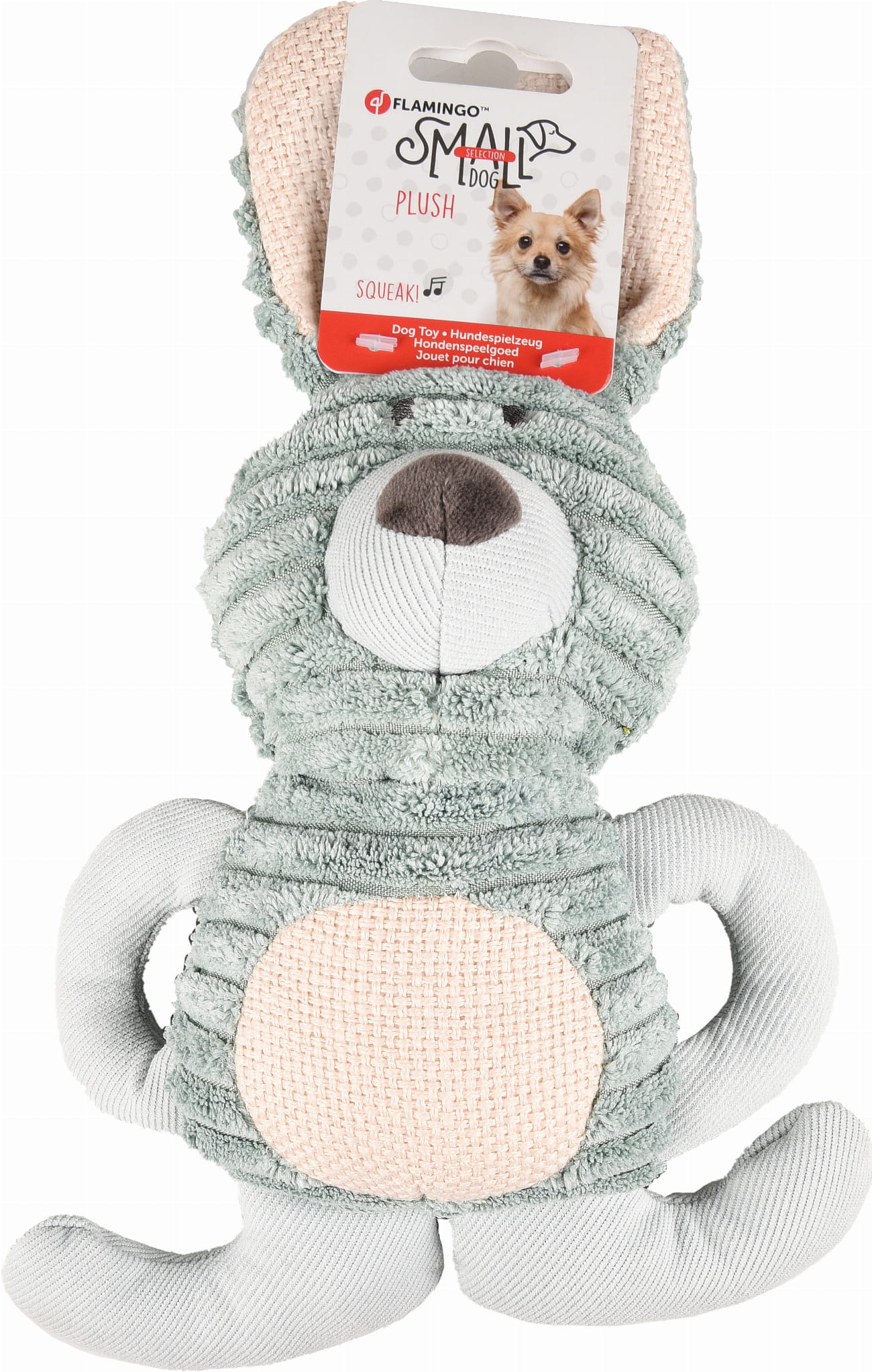 Zabawka dla szczeniaka wykonana została z miękkiej tkaniny sztruksowej oraz pluszu. Sprawdzi się również u psów dorosłych małych ras.