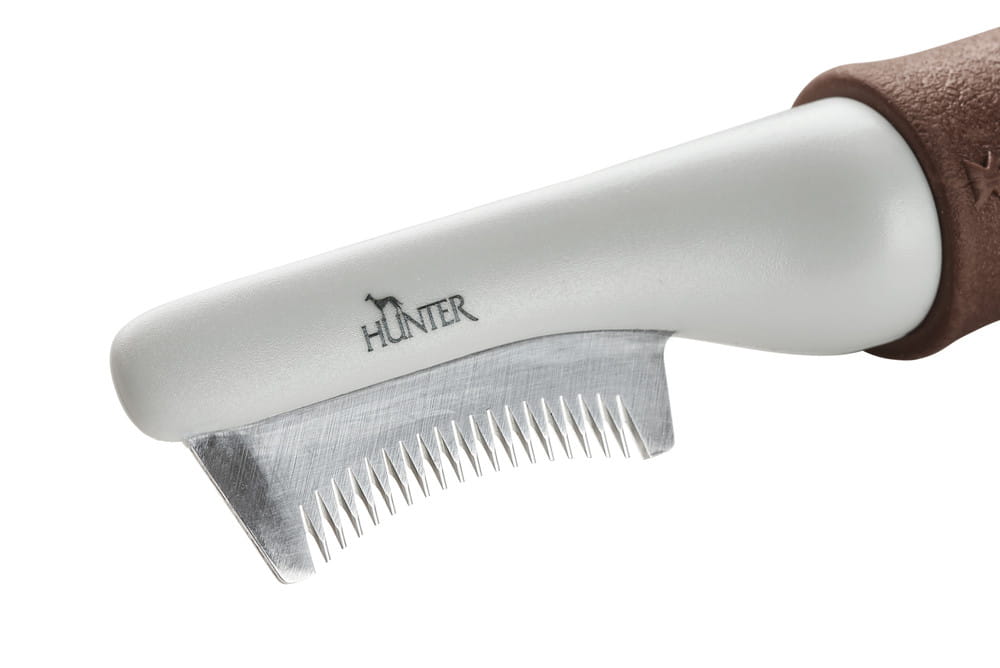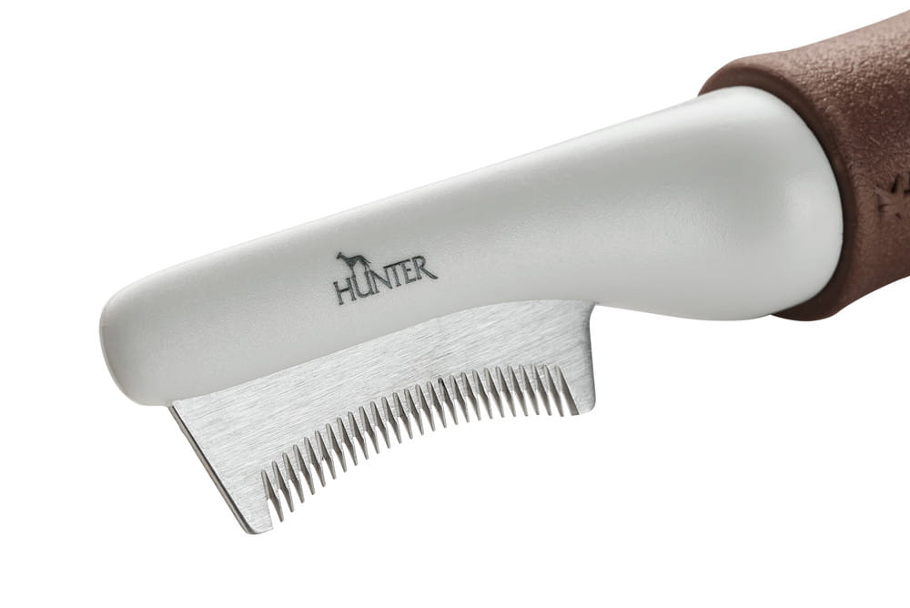 Nóż w kształcie półksiężyca, marki HUNTER doskonale sprawdza się u zwierząt z każdą długością sierści. Pozwala na szybkie i wygodne wyczesywanie w miejscach trudno dostępnych, jak brzuch, pysk, łapy.