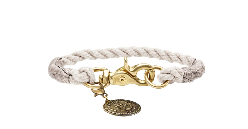 Piękna obroża z serii List zachwyca. Stworzona ze skręconej liny oraz dużego mosiężnego zapięcia. Do obroży doczepiony jest niewielki medalion z wytłoczoną kotwicą.
