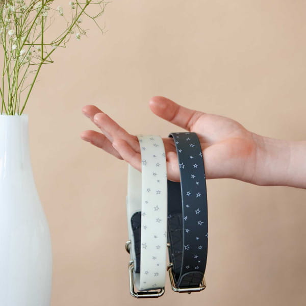 Zdobienie w postaci cętek wykonane zostało z materiału odblaskowego oraz fluorescencyjnego (obroża świeci w nocy), dzięki któremu mamy pewność, że nasz pies jest widoczny po zmroku czy w niekorzystnych warunkach pogodowych.