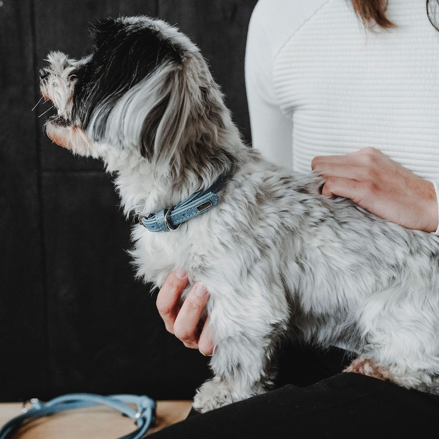 D-ring do mocowania do smyczy wszyty jest ręcznie, w manufakturze w Bielefeld - bezpośrednio obok zapięcia, dzięki czemu nie przylega do delikatnej krtani czworonożnego przyjaciela.