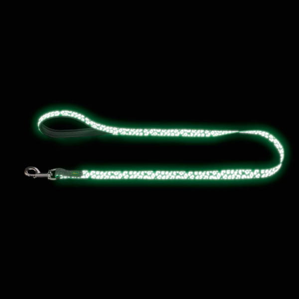 Zdobienie w postaci cętek wykonane zostało z materiału odblaskowego oraz fluorescencyjnego (smycz świeci w nocy), dzięki któremu mamy pewność, że nasz pies jest widoczny po zmroku czy w niekorzystnych warunkach pogodowych.