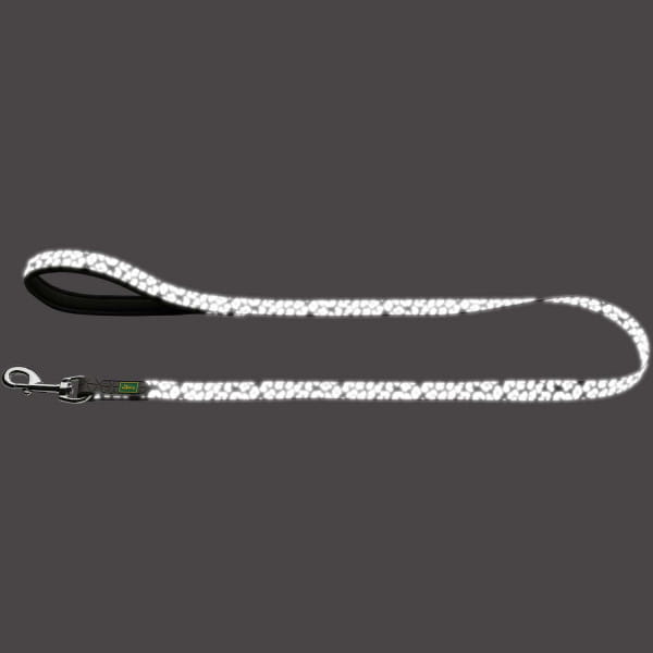 Cętki stanowiące ozdobę smyczy wykonane zostały z materiału odblaskowego, dzięki czemu poprawiona jest widoczność psa po zmroku, czy w niekorzystnych warunkach pogodowych.