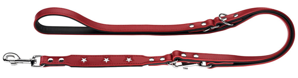 Smycz z serii Magic Star wykonana została ze skóry bydlęcej. Ręczne przeszycia wykonywane w niemieckiej fabryce są gwarancją najwyższej jakości akcesoriów dla zwierząt. Smycz dzięki możliwości szybkiej regulacji doskonale sprawdza się zarówno w mieście jak i w trakcie leśnych spacerów.
