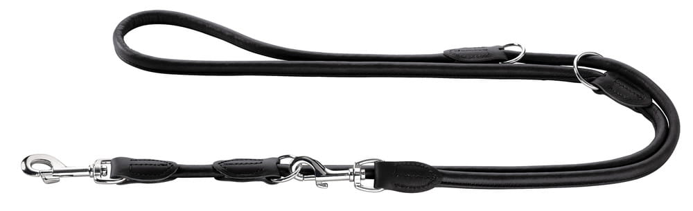 Dzięki wykorzystaniu skóry bydlęcej smycz jest odporna i trwała. Proces barwienia, olejowania i natłuszczania gwarantuje najwyższą jakość gotowego już produktu. Smycz zyskuje odpowiednią elastyczność i giętkość. Dzięki trzem d-ringom istnieje możliwość płynnej i wygodnej regulacji długości smyczy. Metalowe elementy zostały wzmocnione warstwą niklu chroniącego przed szkodliwym działaniem zmiennych warunków atmosferycznych.